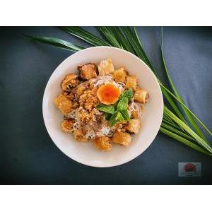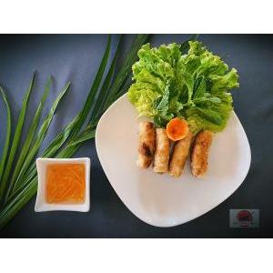 Vermicelle de riz, nems, salade, carottes râpées,pousses de soja, menthe, cacahuète, oignon frit, et sauce maison