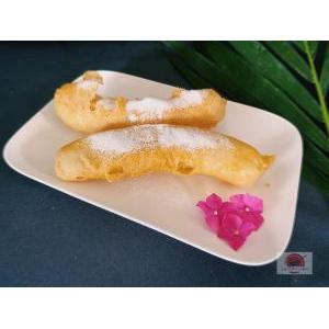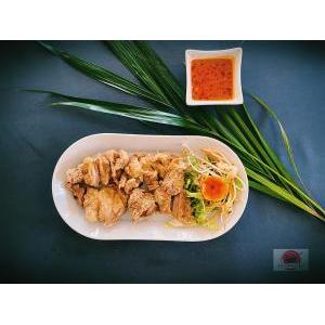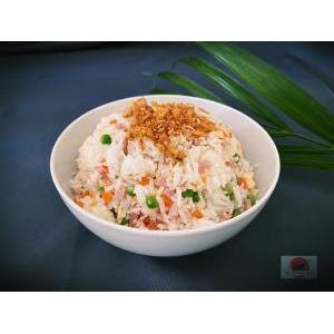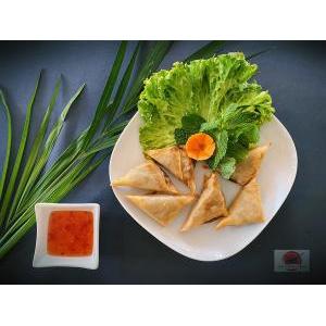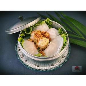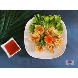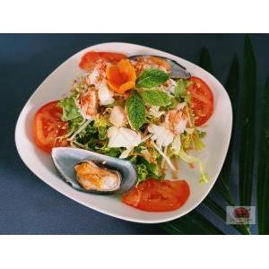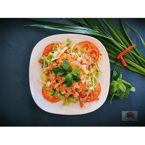 Crevettes, salade, carottes râpées,pousses de soja, menthe, tomate, oignon frit, et sauce maison