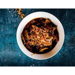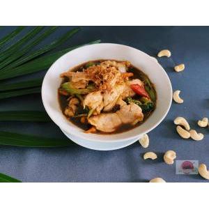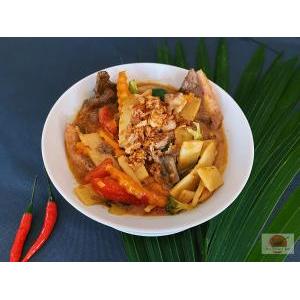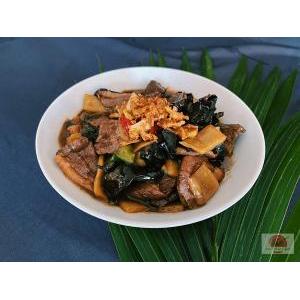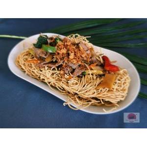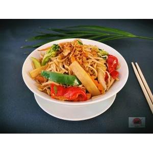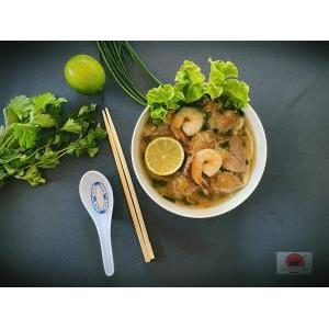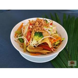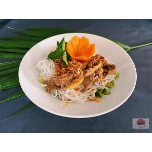 Vermicelle de riz, boeuf VF, sauté citronnelle, oignon au wok, salade, carottes râpées,pousses de soja, menthe, cacahuète, oignon frit, et sauce maison