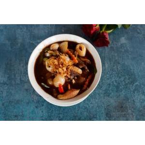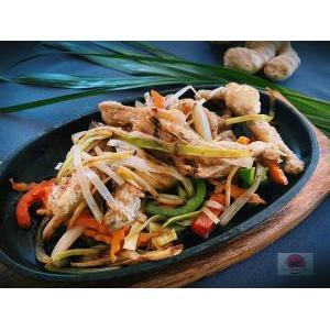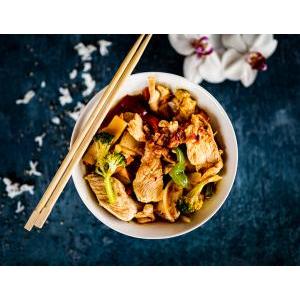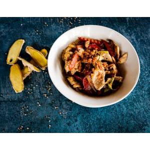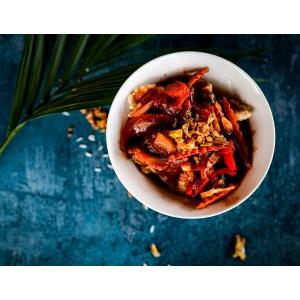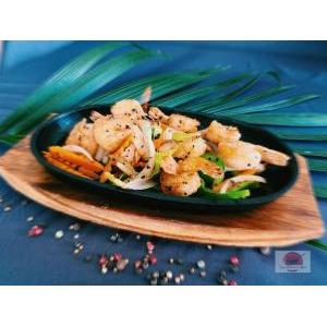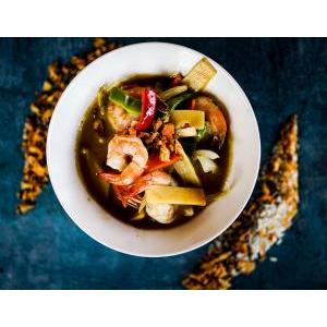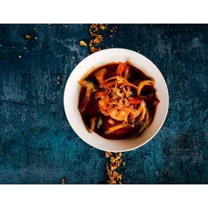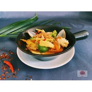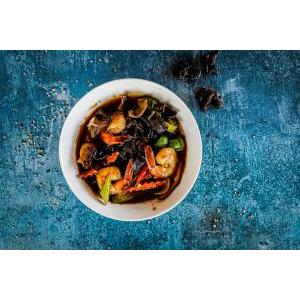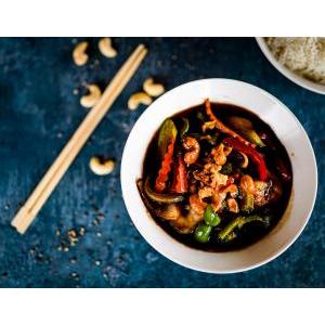 Crevettes décortiquées saute au wok avec légumes frais et variés, poivre noir cassé minute